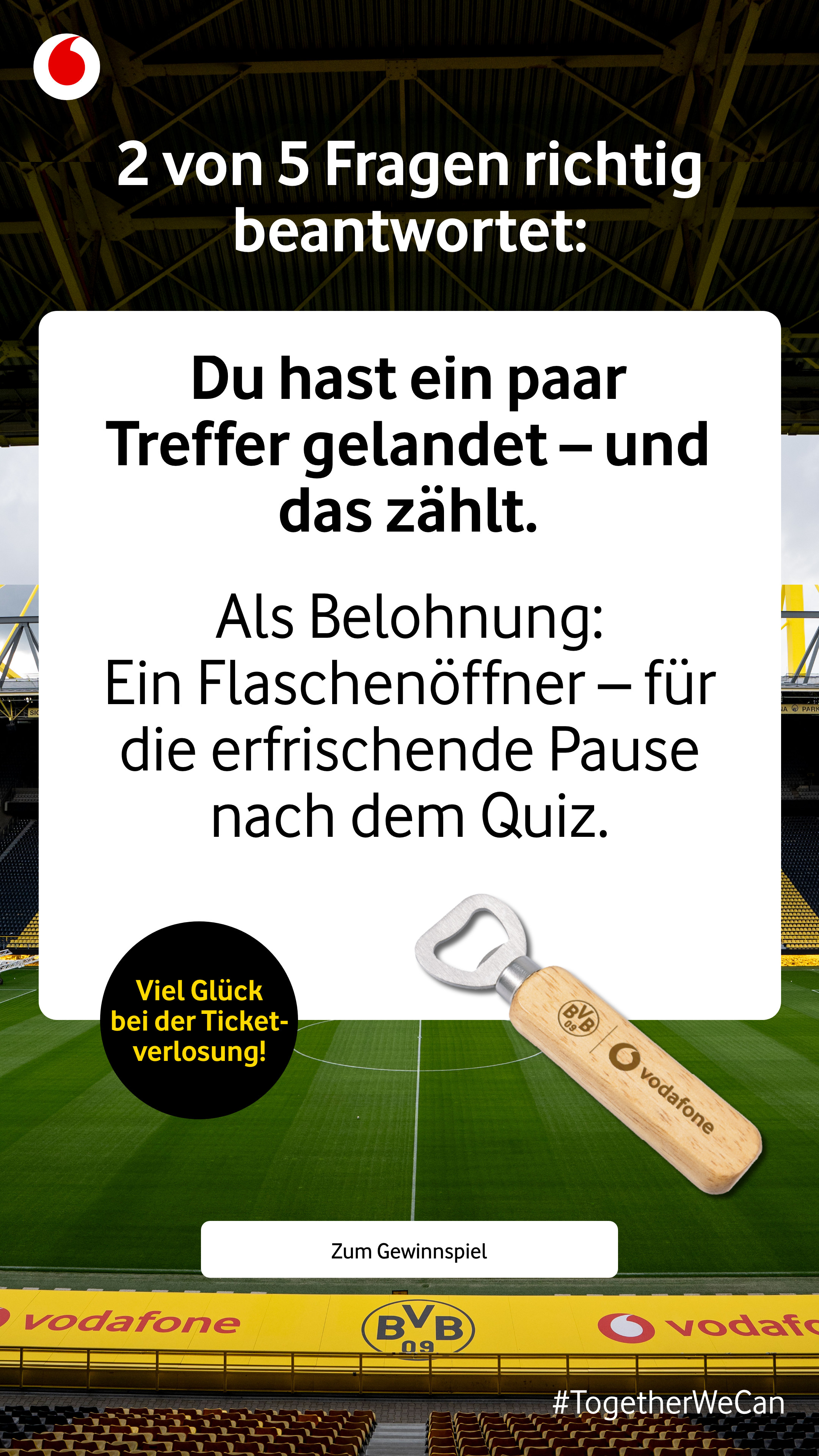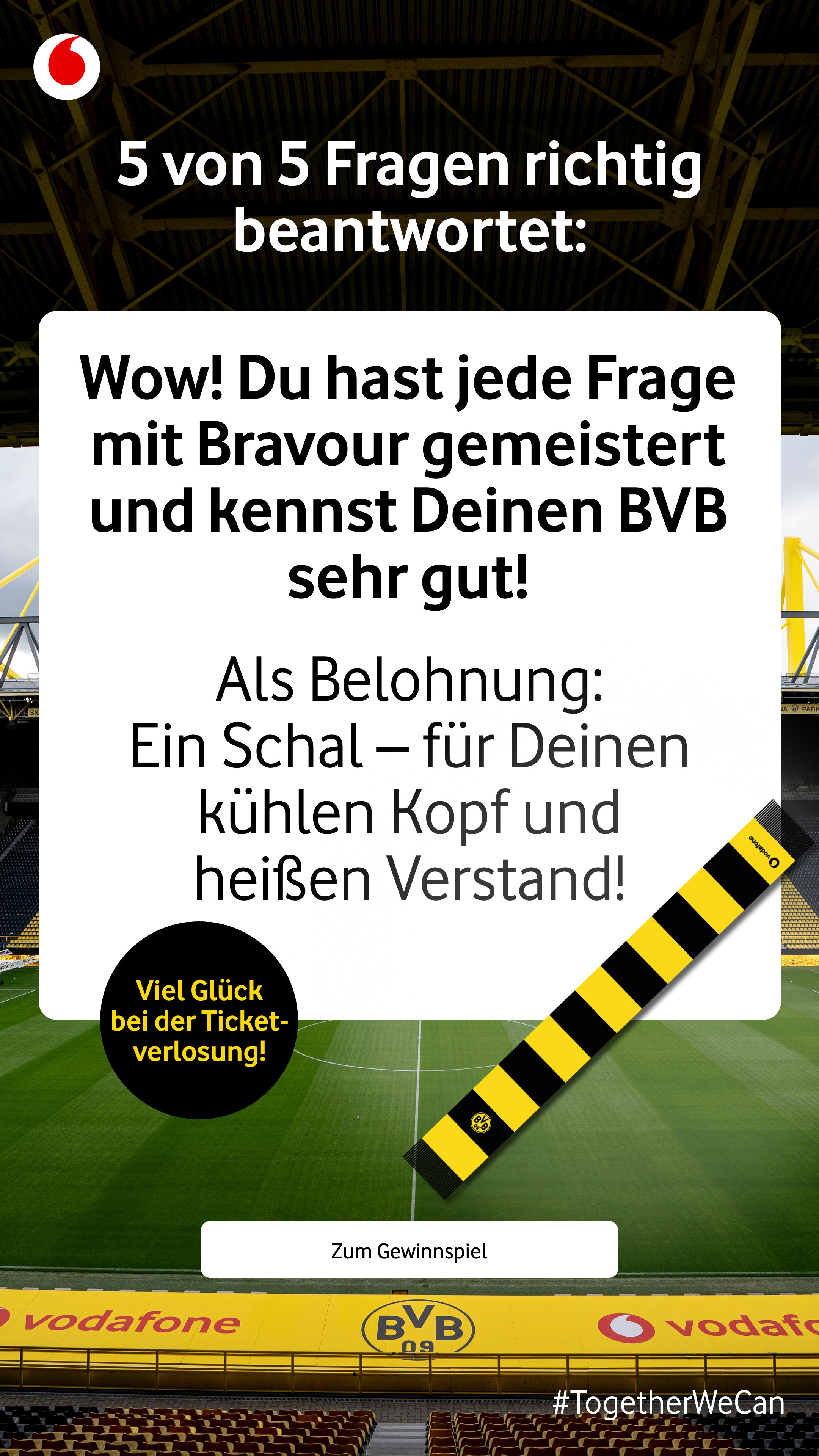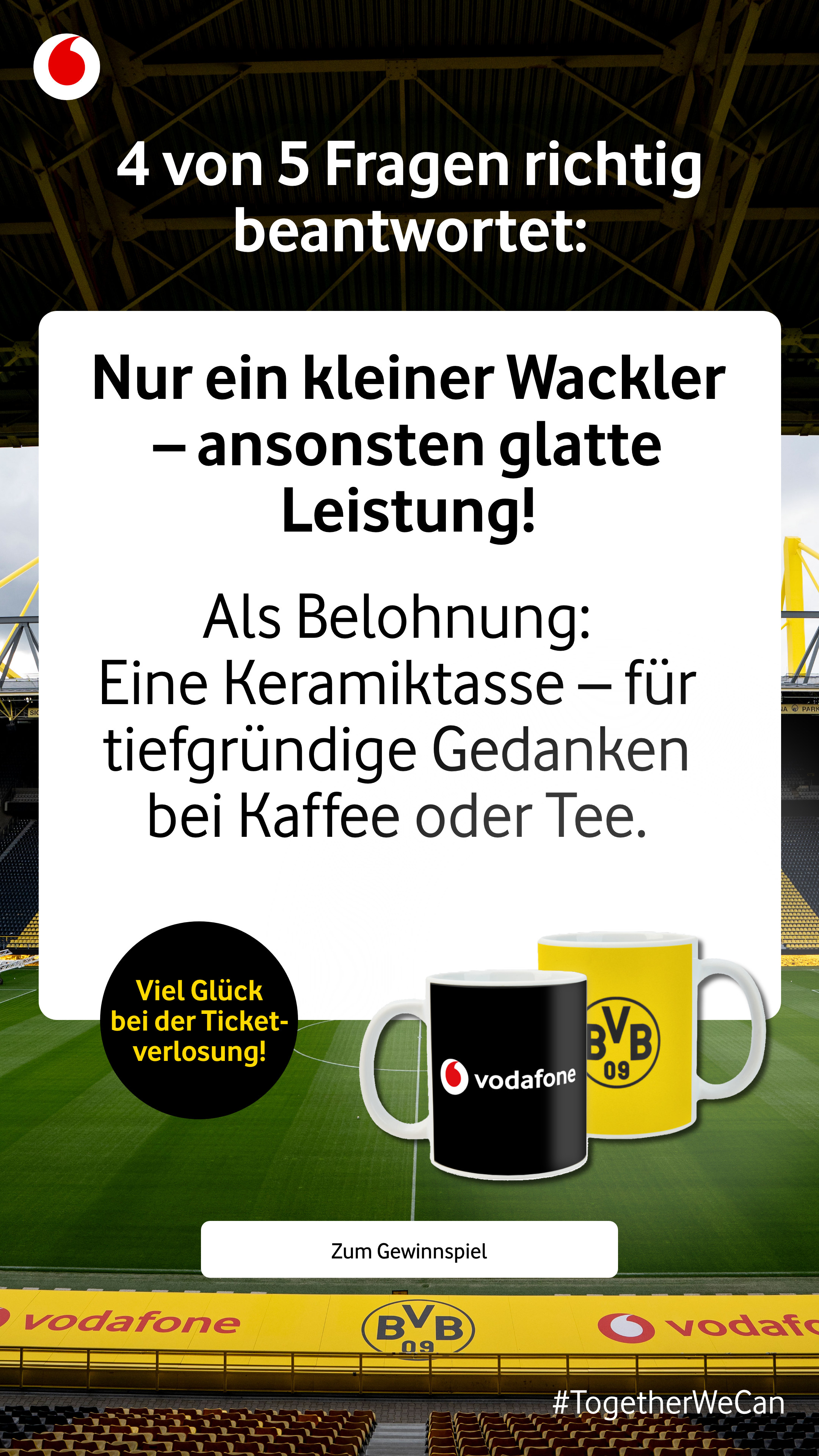 Veranstalter dieses Gewinnspiels: Vodafone GmbH, Ferdinand-Braun-Platz 1, 40549 Düsseldorf. Teilnahmeberechtigt sind ausschließlich natürliche Personen, die ihren Wohnsitz in der Bundesrepublik Deutschland haben. Teilnahmeberechtigt sind volljährige Personen (ausgenommen Mitarbeiter:innen von Vodafone und beauftragte Personen sowie deren Angehörige). Teilnahmezeitraum: Am 07.08.2025 von 10 Uhr bis 18 Uhr im Zuge des BVB-Trikotverkaufs im Vodafone-Shop Dortmund (Westenhellweg 52, 44137 Dortmund). Um einen Sofortgewinn zu erhalten, musst Du beim „BVB-Quiz“ fünf Multiplechoice-Fragen beantworten (Wertigkeit des Gewinns abhängig von der Anzahl der richtig beantworteten Fragen). Wenn Du zusätzlich am Gewinnspiel für zwei Tagestickets für das Saisonspiel des BVBs (8. Spieltag) teilnehmen möchtest, musst Du die Kontaktfelder wahrheitsgemäß ausfüllen. Teilnahme nur einmal pro Person. Gewinnermittlung per Losverfahren.