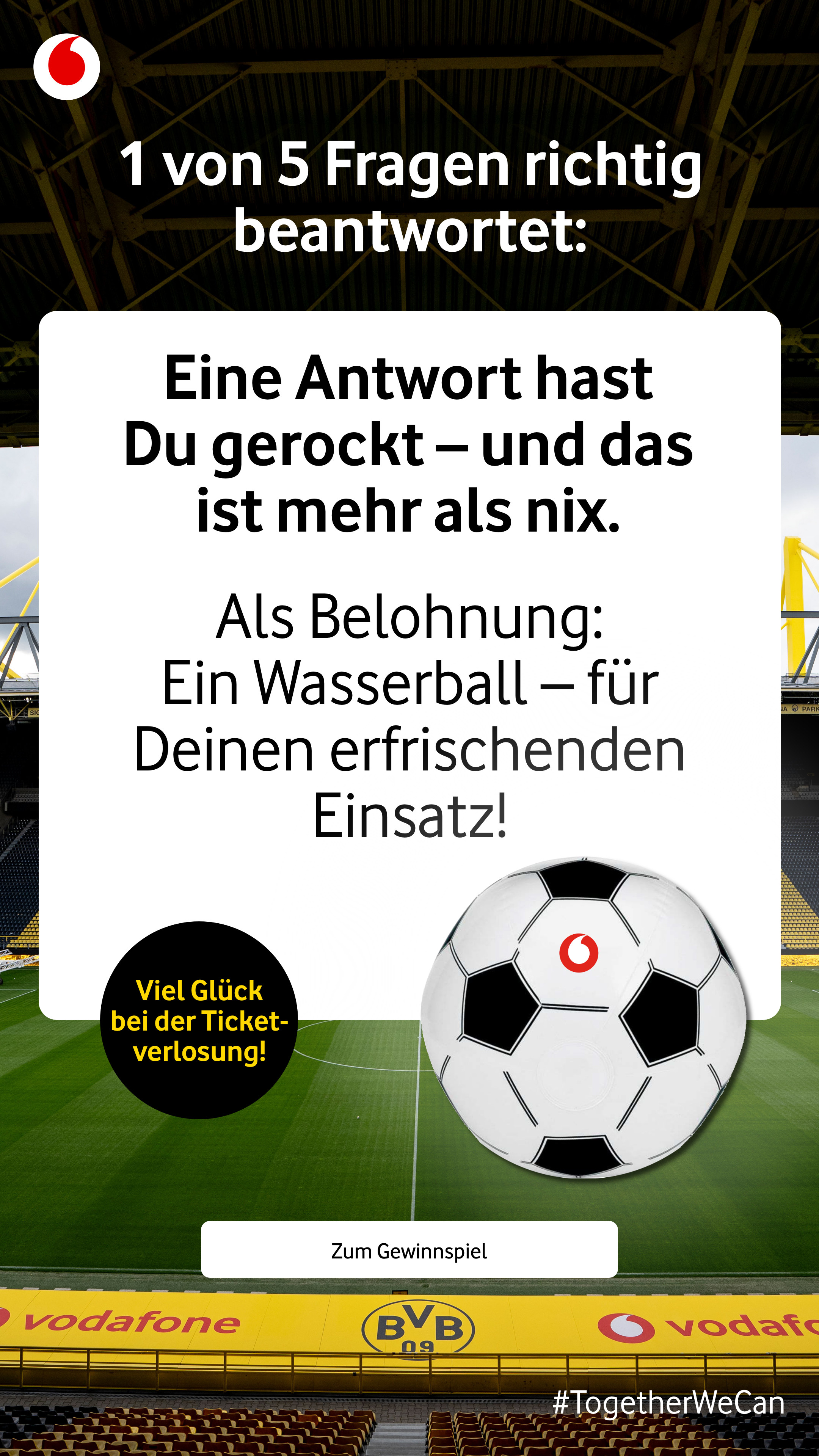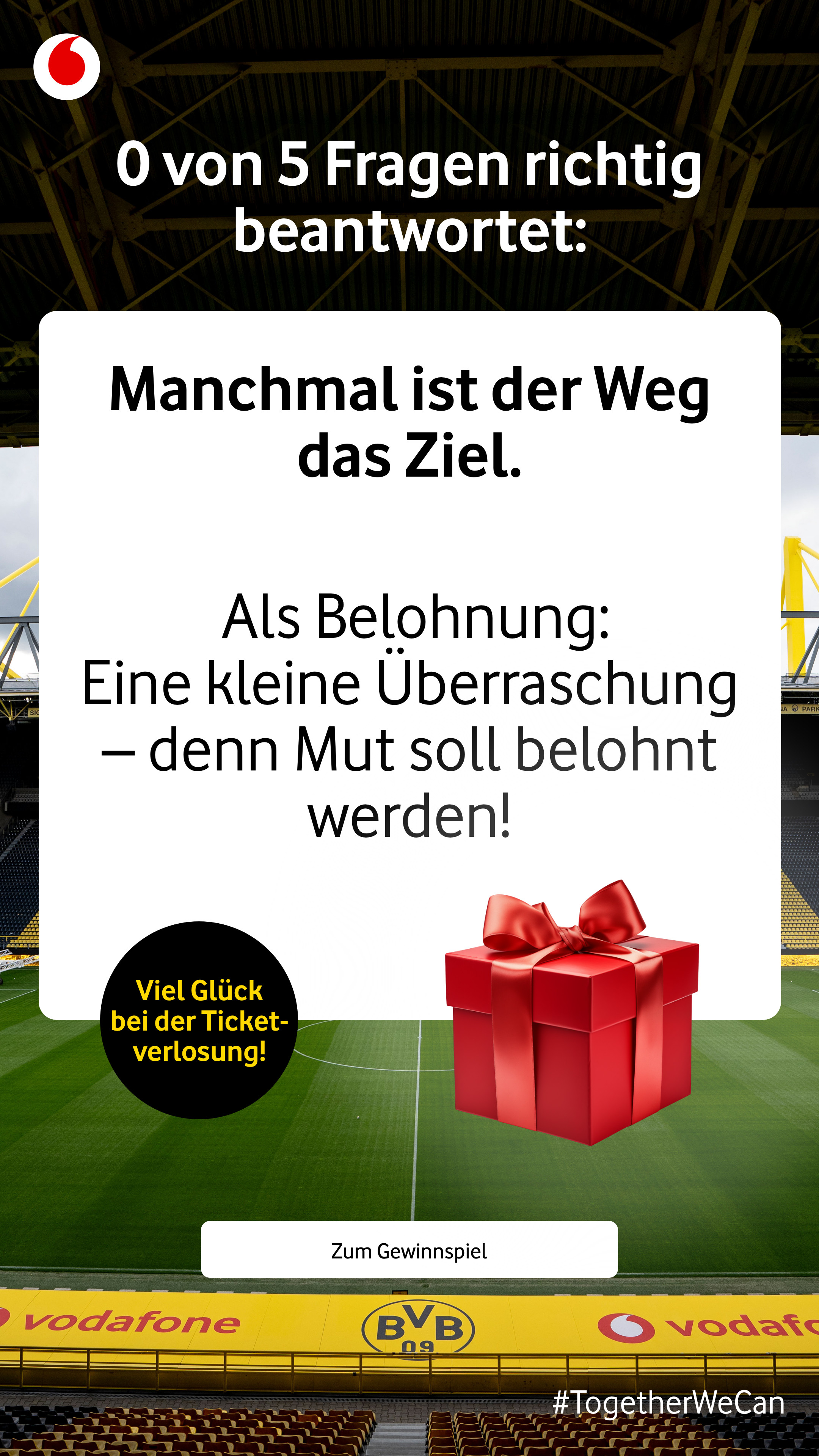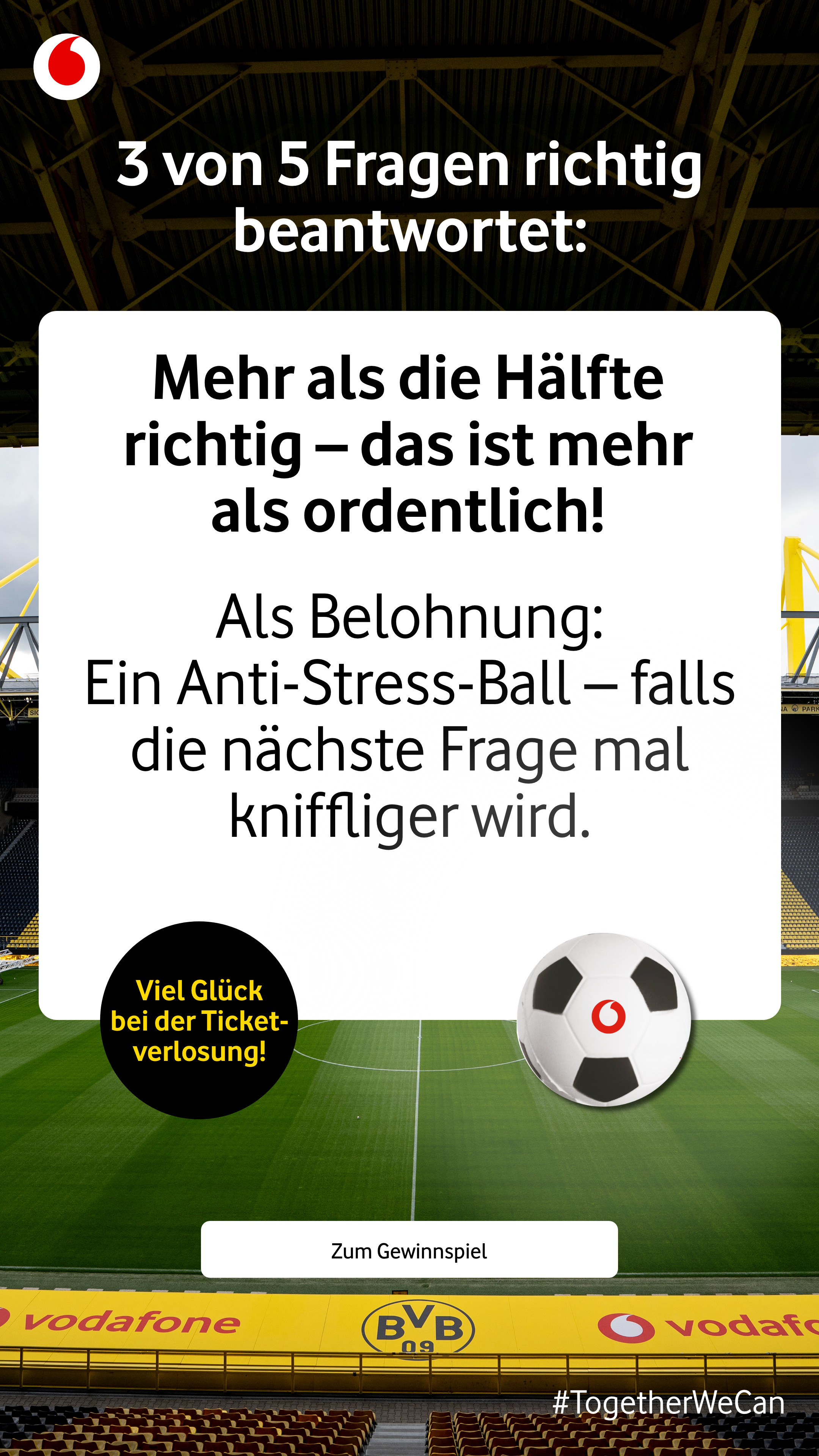 Veranstalter dieses Gewinnspiels: Vodafone GmbH, Ferdinand-Braun-Platz 1, 40549 Düsseldorf. Teilnahmeberechtigt sind ausschließlich natürliche Personen, die ihren Wohnsitz in der Bundesrepublik Deutschland haben. Teilnahmeberechtigt sind volljährige Personen (ausgenommen Mitarbeiter:innen von Vodafone und beauftragte Personen sowie deren Angehörige). Teilnahmezeitraum: Am 07.08.2025 von 10 Uhr bis 18 Uhr im Zuge des BVB-Trikotverkaufs im Vodafone-Shop Dortmund (Westenhellweg 52, 44137 Dortmund). Um einen Sofortgewinn zu erhalten, musst Du beim „BVB-Quiz“ fünf Multiplechoice-Fragen beantworten (Wertigkeit des Gewinns abhängig von der Anzahl der richtig beantworteten Fragen). Wenn Du zusätzlich am Gewinnspiel für zwei Tagestickets für das Saisonspiel des BVBs (8. Spieltag) teilnehmen möchtest, musst Du die Kontaktfelder wahrheitsgemäß ausfüllen. Teilnahme nur einmal pro Person. Gewinnermittlung per Losverfahren.
